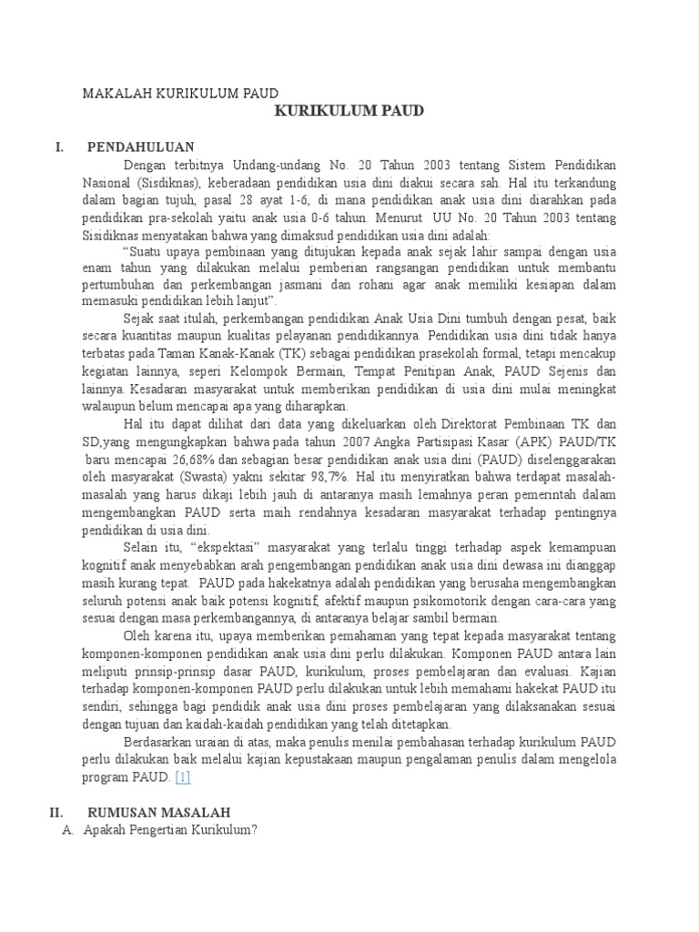 Makalah kurikulum pendidikan anak usia dini. Hal itu dapat dilihat dari data yang dikeluarkan oleh Direktorat Pembinaan TK dan SD yang mengungkapkan bahwa pada tahun 2007 Angka Partisipasi Kasar APK PAUDTK baru mencapai 2668 dan sebagian besar pendidikan anak usia dini PAUD diselenggarakan oleh masyarakat Swasta yakni sekitar. Maka kurikulum pendidikan pun disesuaikan dengan nilai-nilai pancasil itu sendiri. Dalam UU NO.